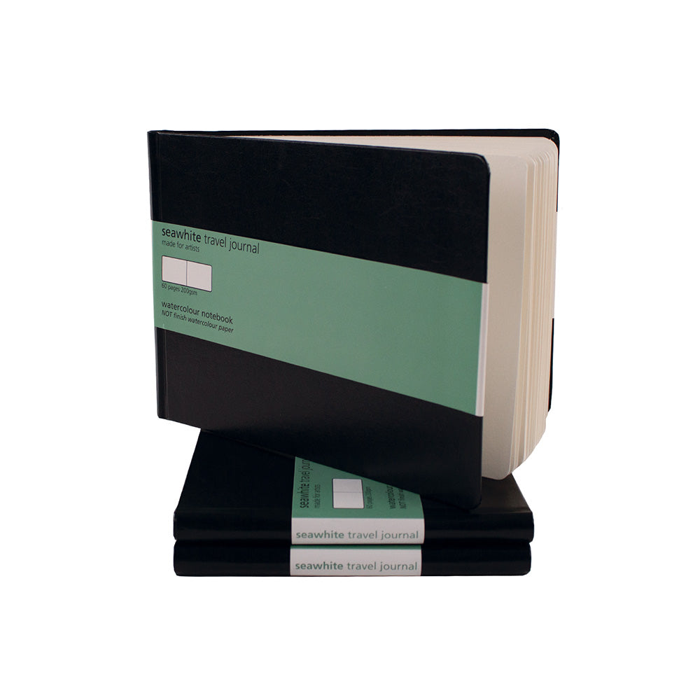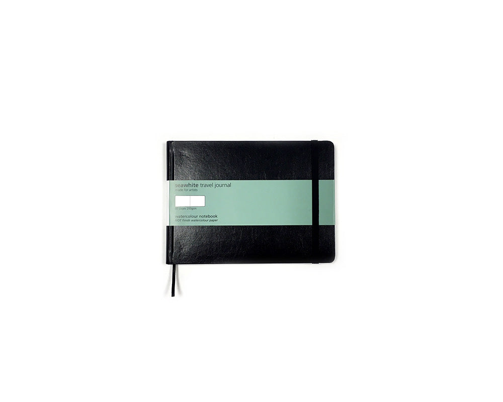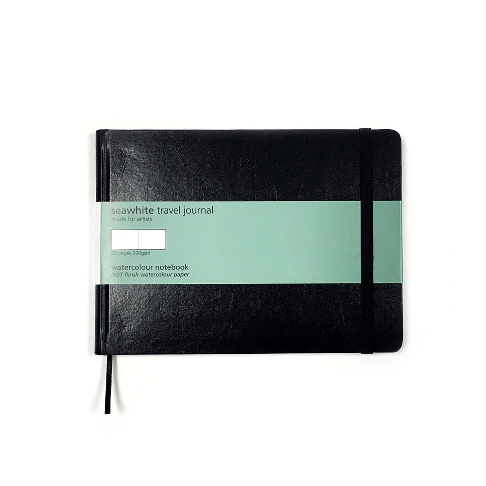 Landscape Watercolour A5 Travel Journal, containing 60 pages/30 sheets 200gsm watercolour paper (plain pages).  Acid free, NOT finish (slightly textured surface) with lovely 'tooth' for writing.  It has a black hardback cover with sewn binding and a useful interior back pocket. It has an elastic retaining band and ribbon marker.