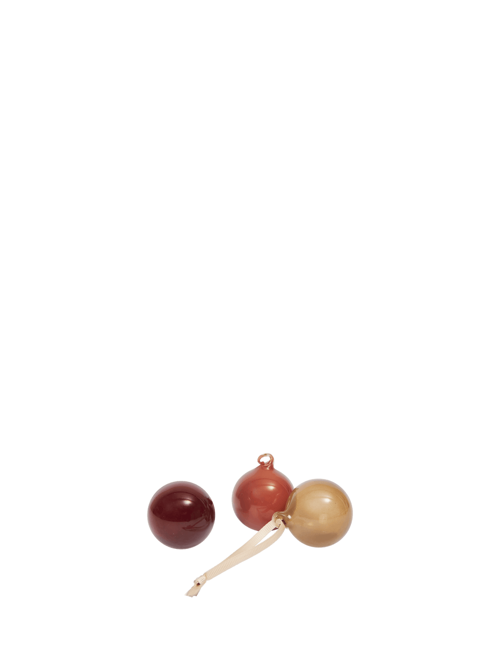 The Glass Baubles welcome the holiday season with subtle charm. These delicate spheres softly catch and reflect light, adding a refined, understated touch to your festive décor. Each set includes a ribbon, allowing you to hang them at just the right height.  They are made from mouth-blown painted glass and includes 1.2 metres of cream-coloured ribbon.