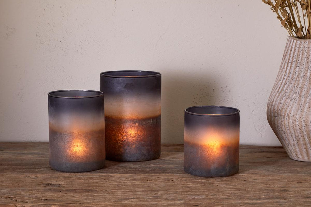 This tealight holder features a dusky blend of navy and smoke tones, creating a soft, ambient glow when lit. The layered colour and subtle rustic finish add depth and interest, making it perfect for seasonal styling or year-round atmosphere. A simple yet striking accent for shelves, tables, or cosy corners.