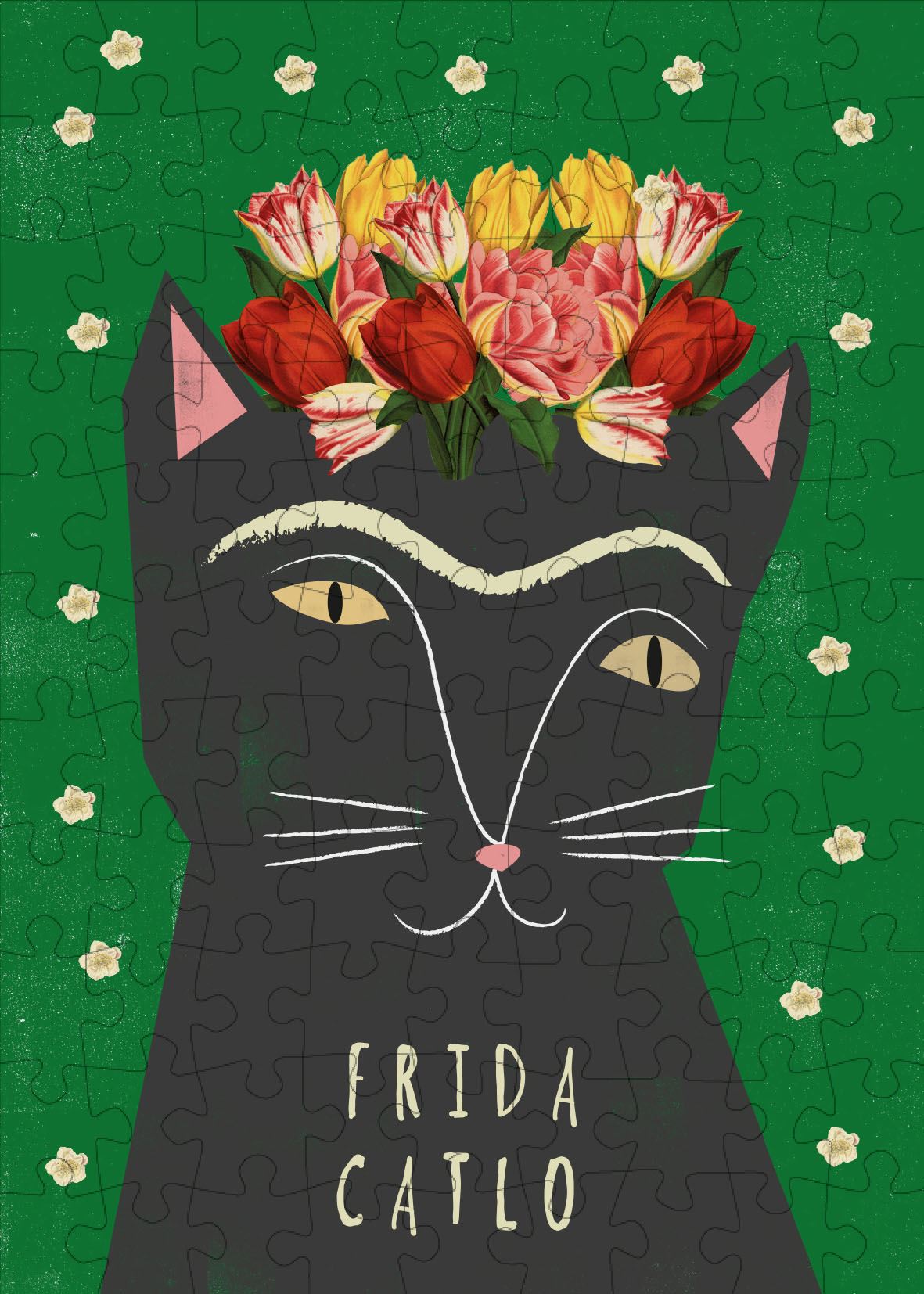 A 99-piece mini jigsaw puzzle featuring a fun cat illustration of Frida Kahlo. The perfect gift for cat lovers. Suitable for ages 12+    Puzzle size: 10cm x 14cm