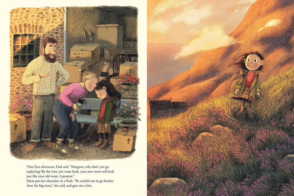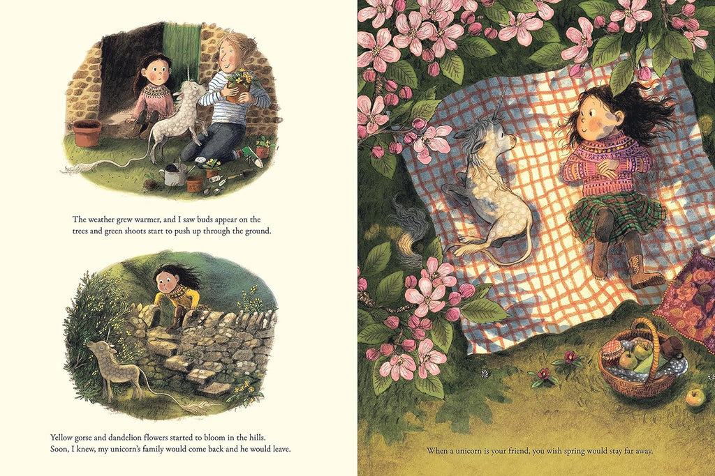 Margaret's whole world changes when her family moves to a cottage by the sea to be near her grandma. One evening, Margaret spots a mist over the water. No, that's not mist...clouds maybe? No, they're unicorns descending onto the shore! They vanish as quickly as they'd appeared, but accidentally leave behind a baby, tangled in the weeds. Margaret, lonely and in need of a friend, brings him home and cares for him through the fall and winter. Together, they chase the waves, stomp on frozen puddles, and build snow unicorns. When spring finally comes around, and the other unicorns return, Margaret's takes her small friend back to his family... but these two won't forget one another. And though Margaret misses him, she has made a new friend, and her new cottage is starting to feel like home. With all the feel of a classic, here is a picture book young readers will want to revisit again and again.